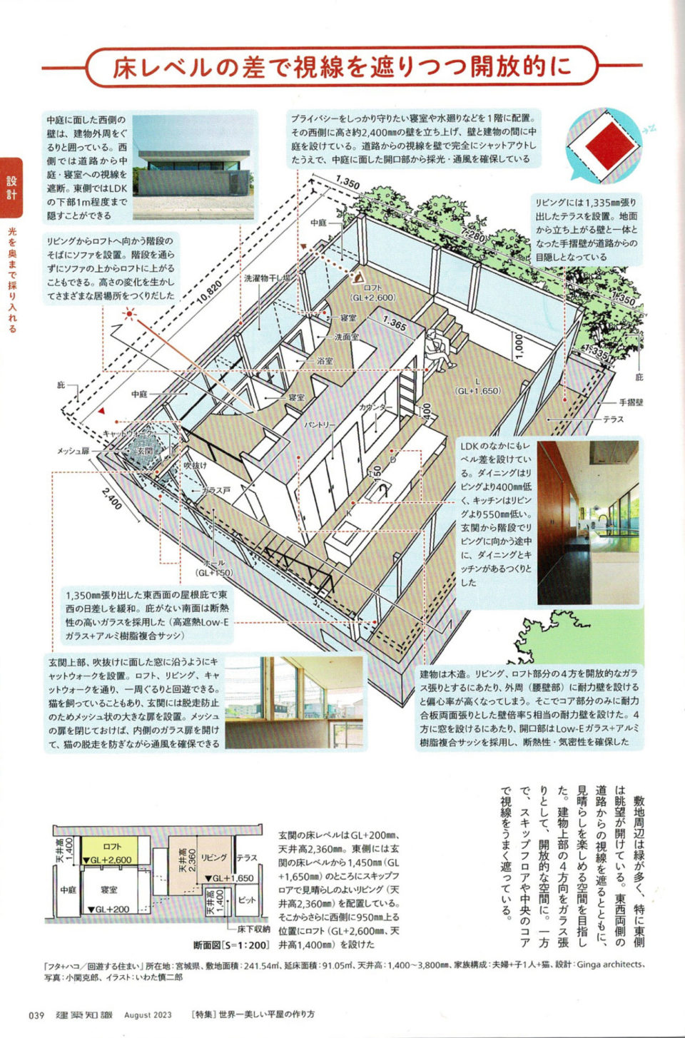 『建築知識23/07 世界一美しい平屋の作り方』 特集に、床レベルの差で視線を遮りつつ開放的にとして『SGA フタ+ハコ/回遊する住まい』が掲載されました。複雑な断面をわかりやすい図解で説明してくれています。