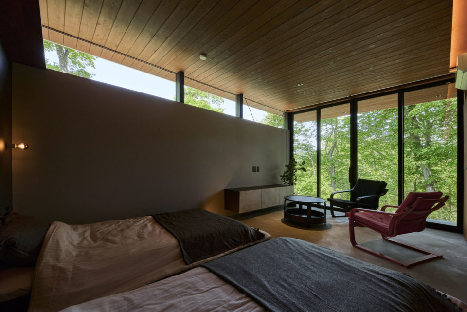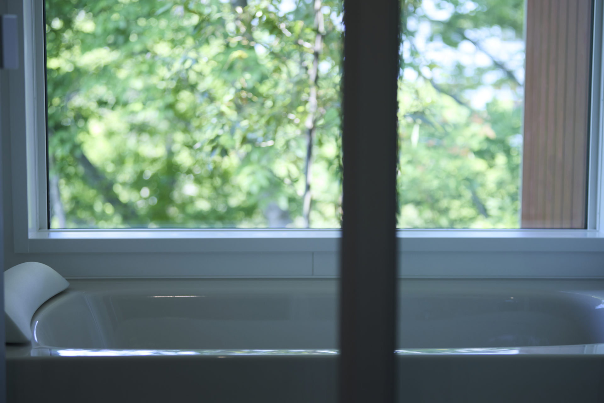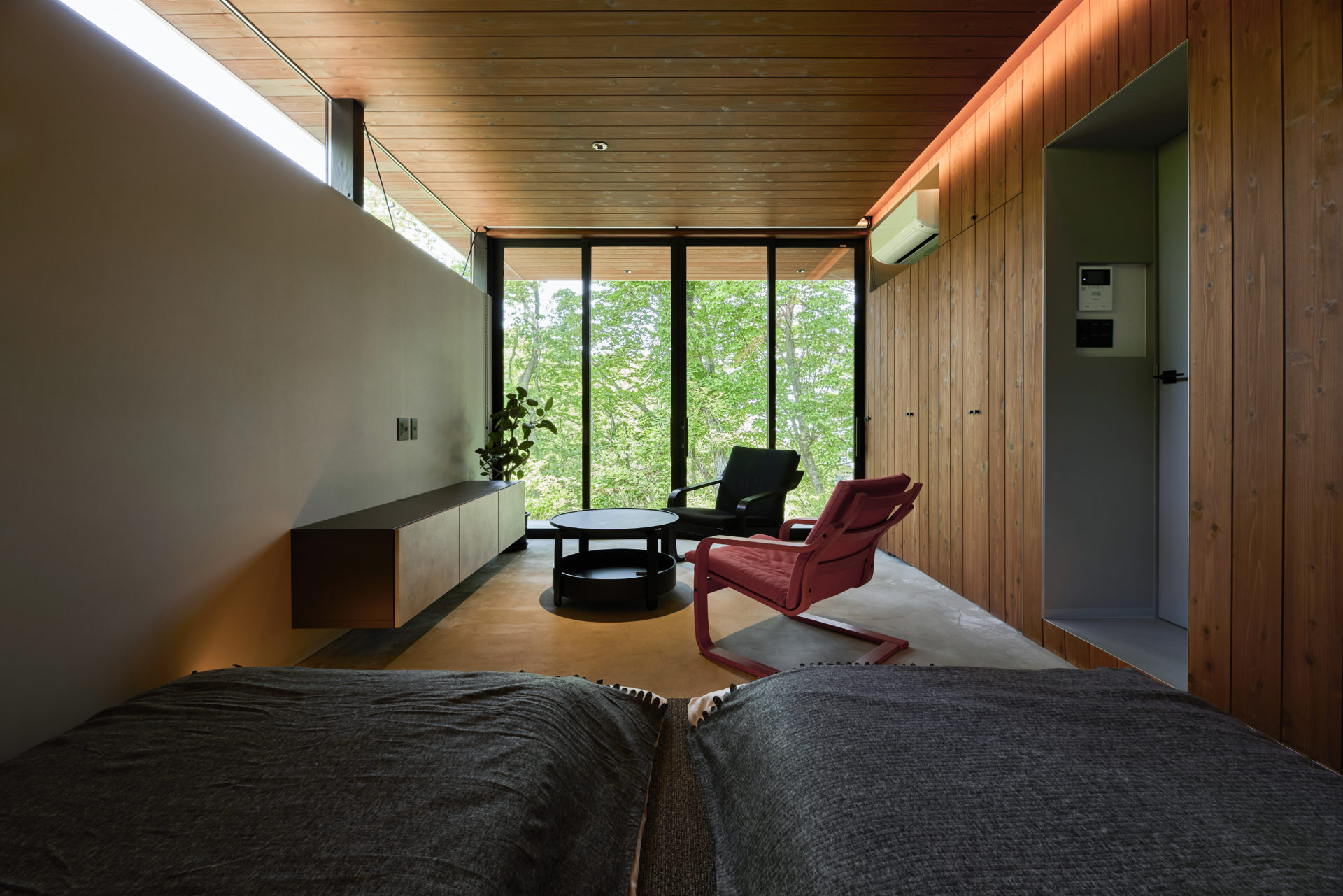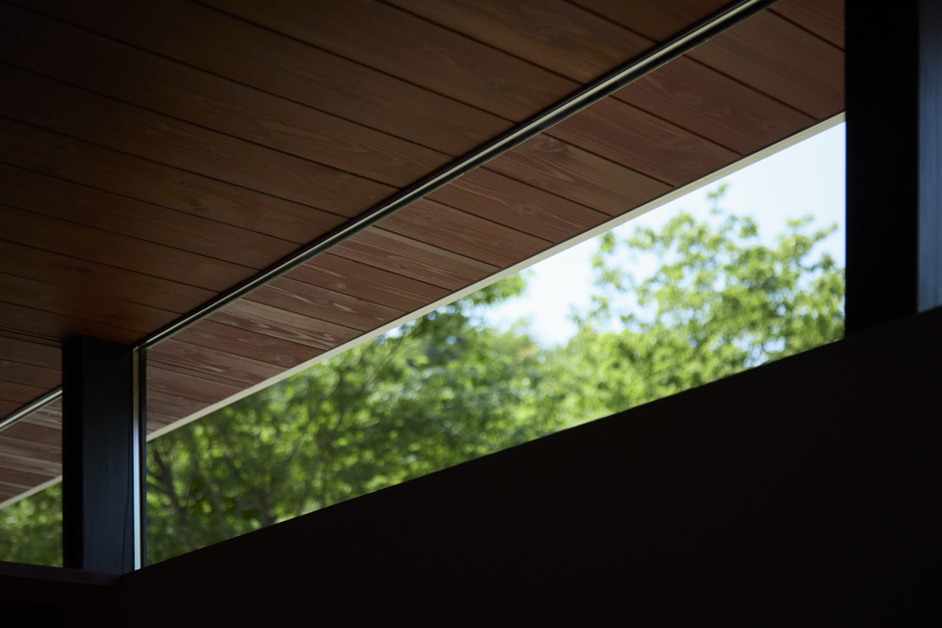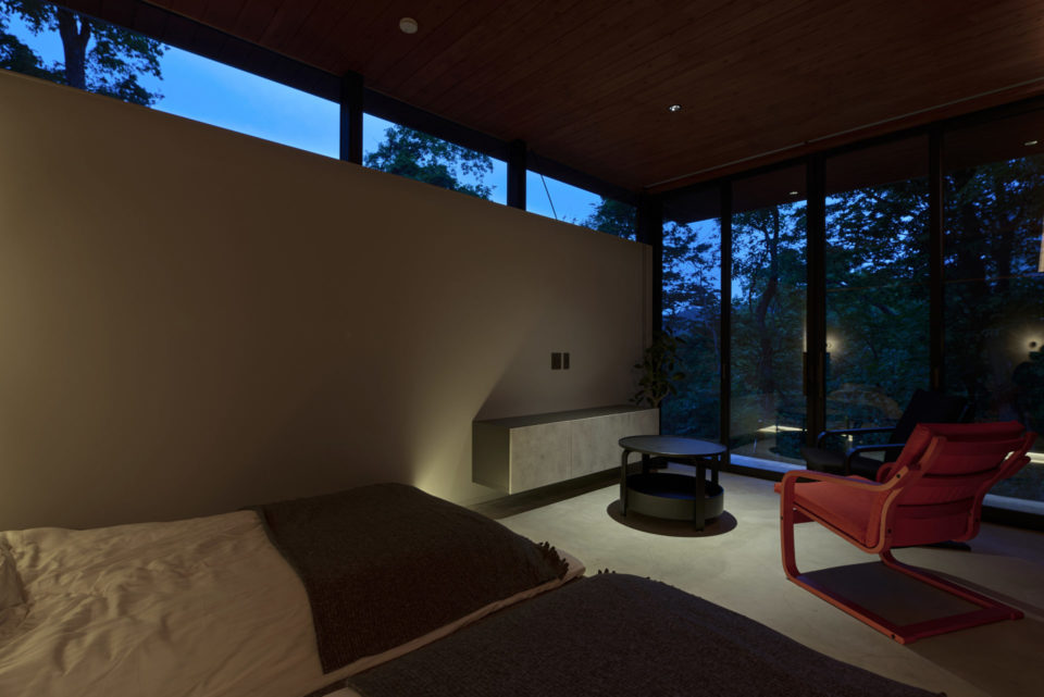 住宅部分は、名取川と磊々狭の断崖を眼前に望む非日常的な空間である。崖から浮かせるように設けたテラスとリビング、ベッドスペースが連続し、3m先に切り立つ崖とその先の渓谷の風景を日常の延長に引き込む。浴室にも大きな窓を設け、湯に浸かりながら四季の移ろいを体感できる。ハイサイドライトからは木陰越しに広がる空が切り取られ、小さな住まいながらも豊かな時間を生み出している。