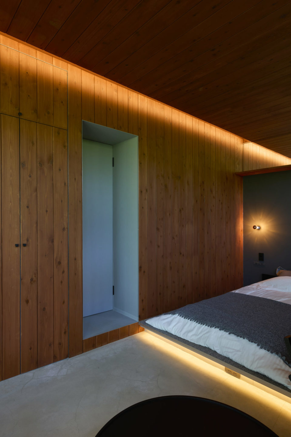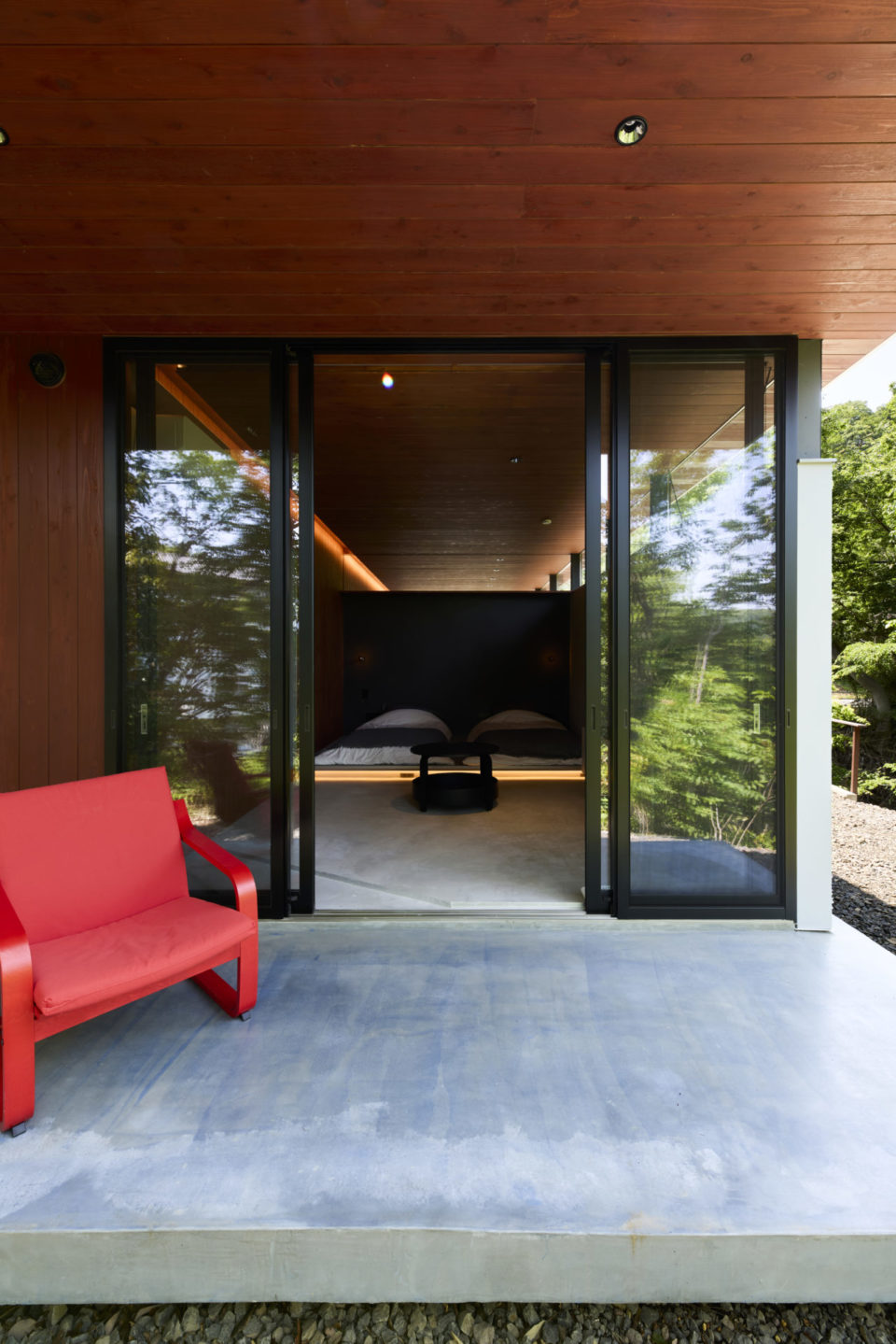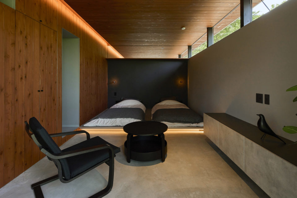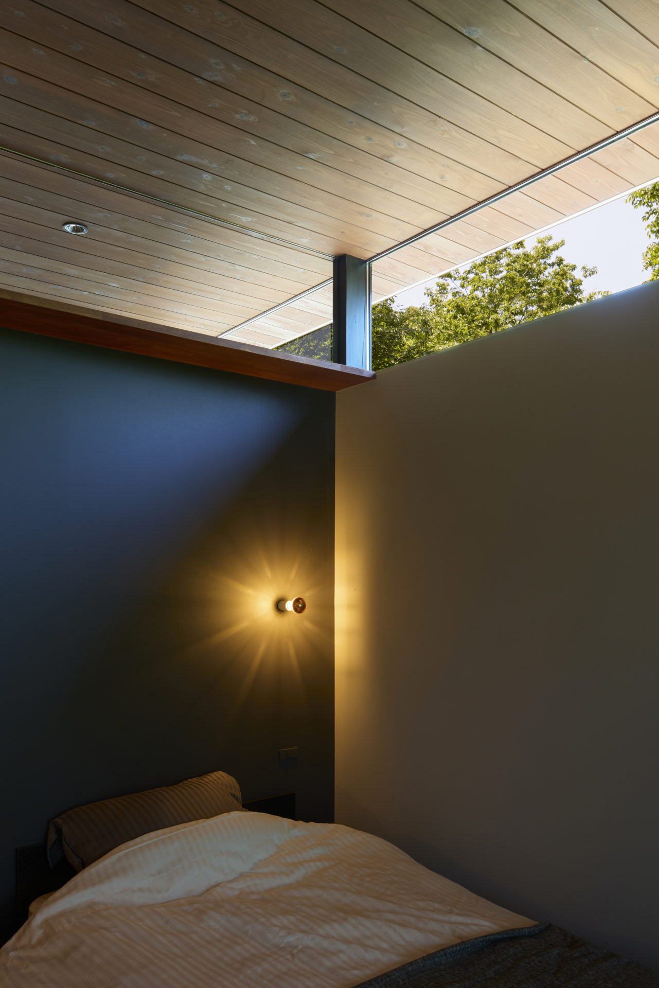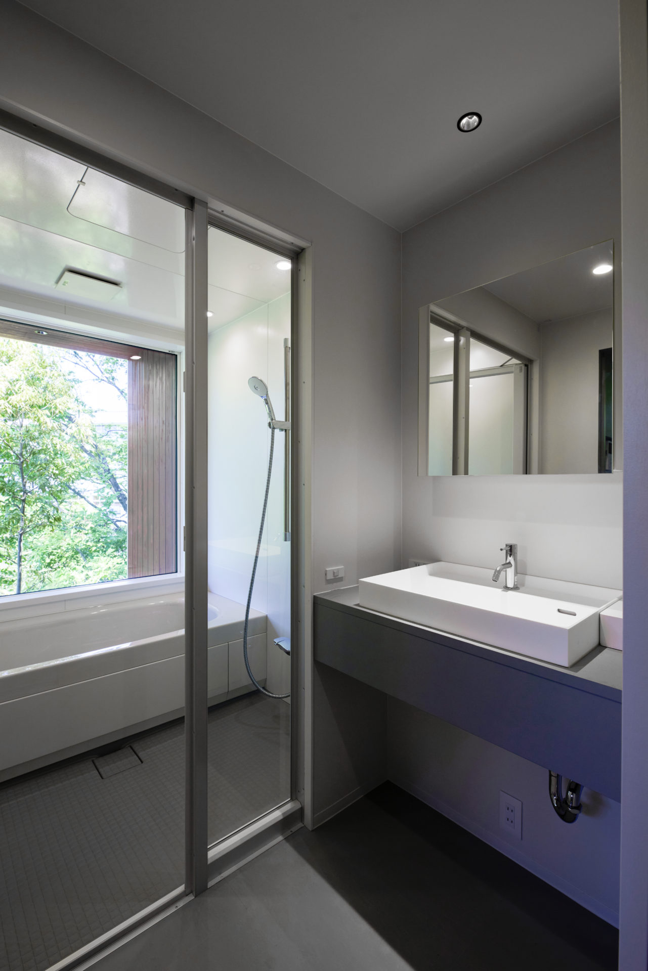 住宅部分は、名取川と磊々狭の断崖を眼前に望む非日常的な空間である。崖から浮かせるように設けたテラスとリビング、ベッドスペースが連続し、3m先に切り立つ崖とその先の渓谷の風景を日常の延長に引き込む。浴室にも大きな窓を設け、湯に浸かりながら四季の移ろいを体感できる。ハイサイドライトからは木陰越しに広がる空が切り取られ、小さな住まいながらも豊かな時間を生み出している。