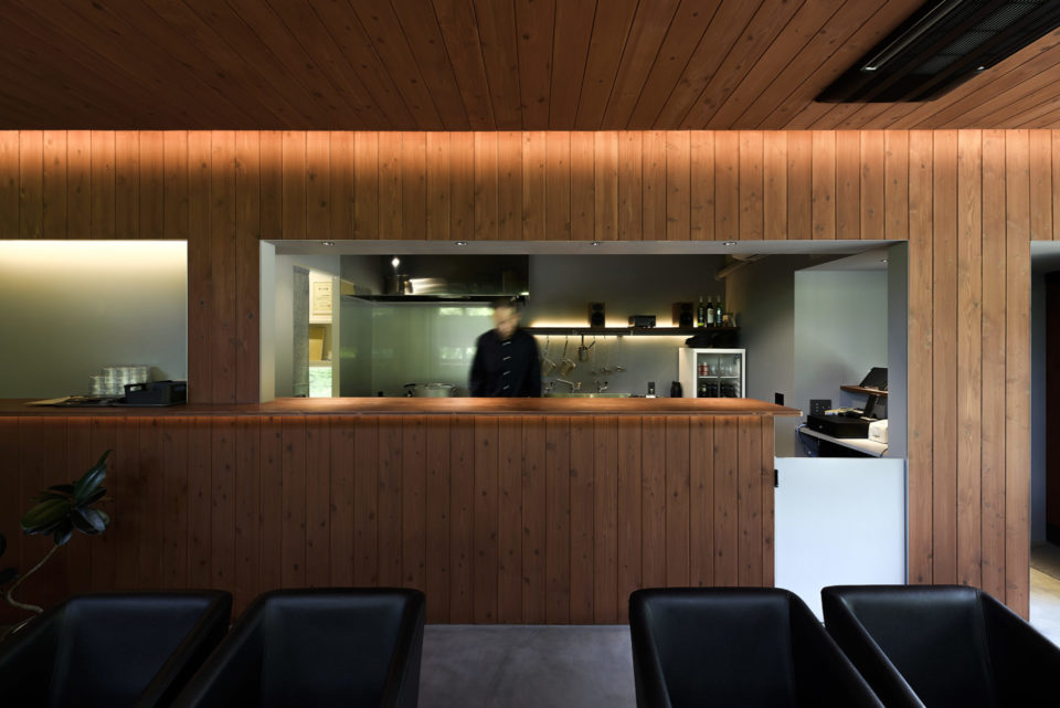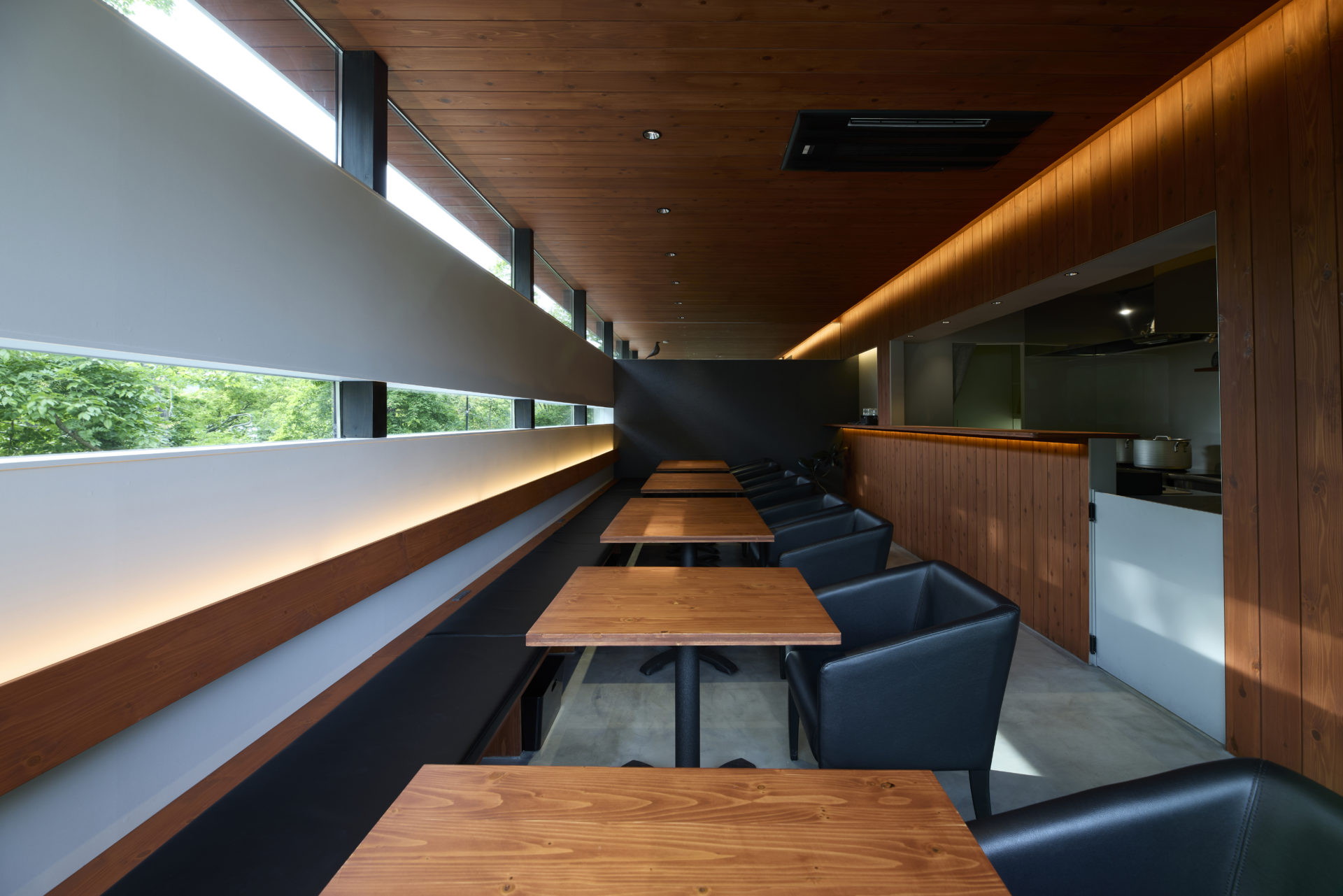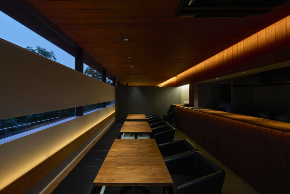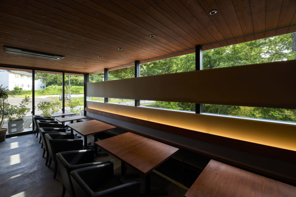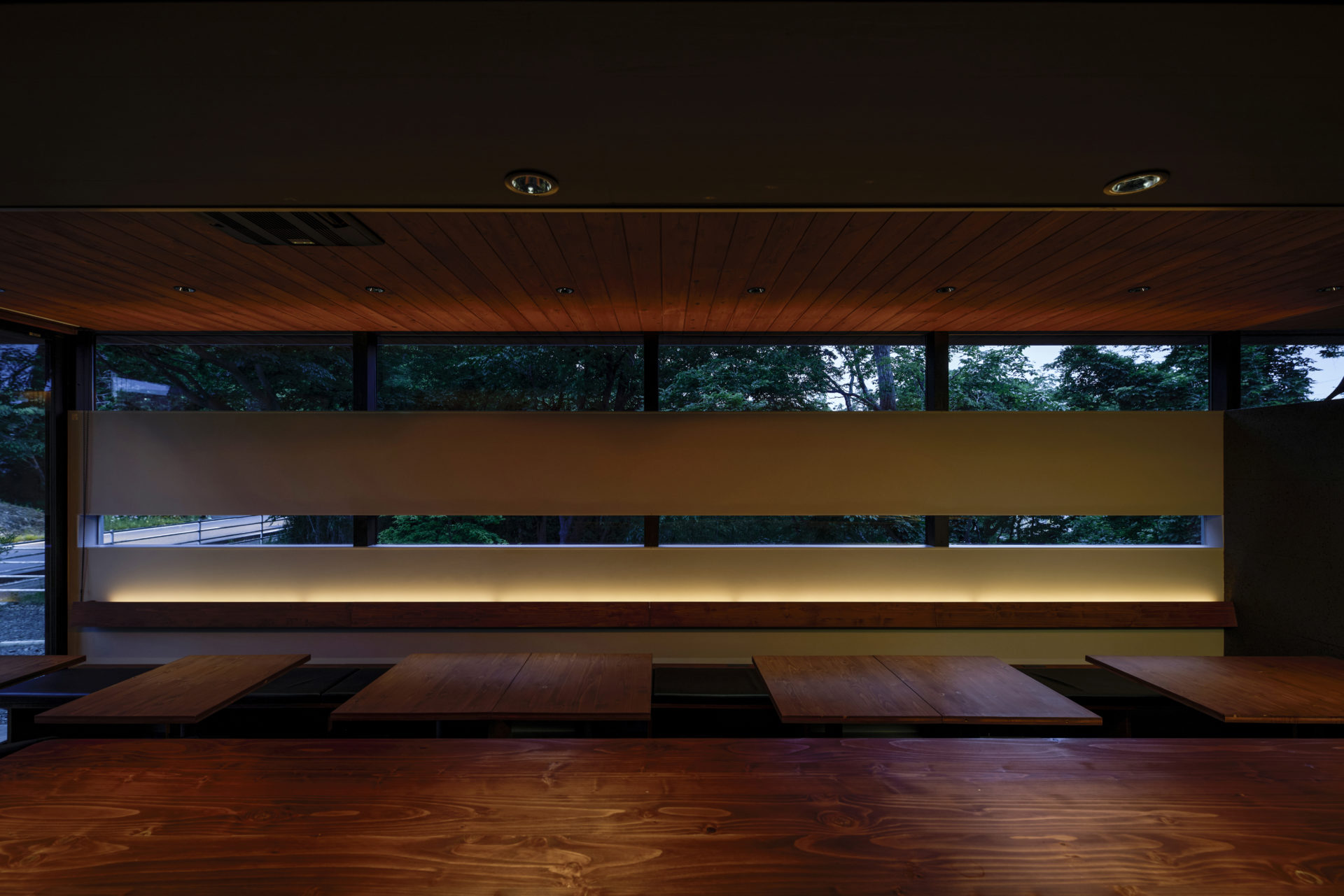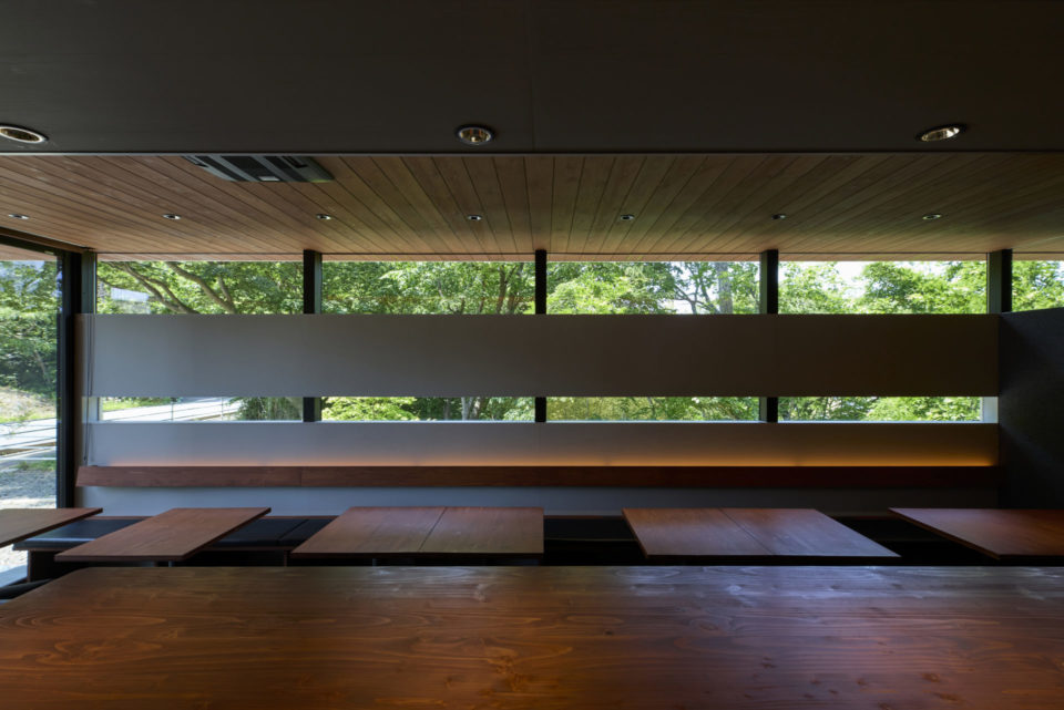 店舗部分は、従来の蕎麦店の形式から離れ、カフェやバーのような落ち着いた雰囲気を求められた。西側にはベンチとテーブル席を、東側にはオープンキッチンとカウンターを配置し、客が調理のリズムや蕎麦の「食べごろ」を間近に感じられる構成とした。仕上げは杉板を深いワインレッドに染め、壁と天井、さらには軒天や外壁にまで連続させている。これにより、内外の境界が曖昧になり、外部の風景そのものが空間に取り込まれる。