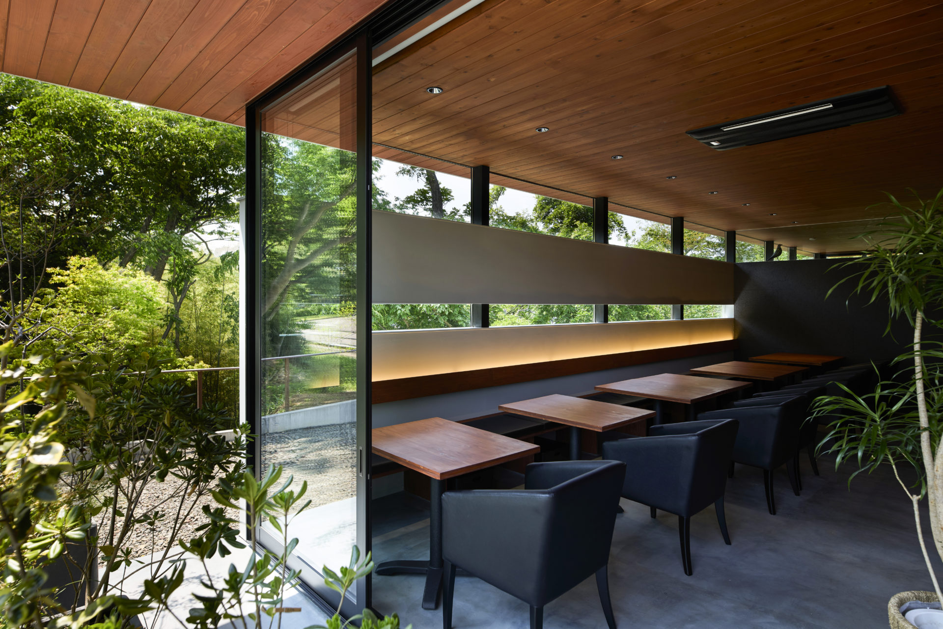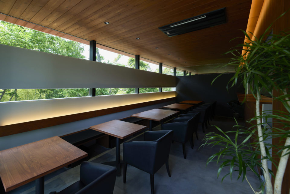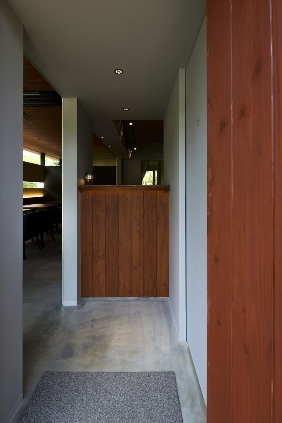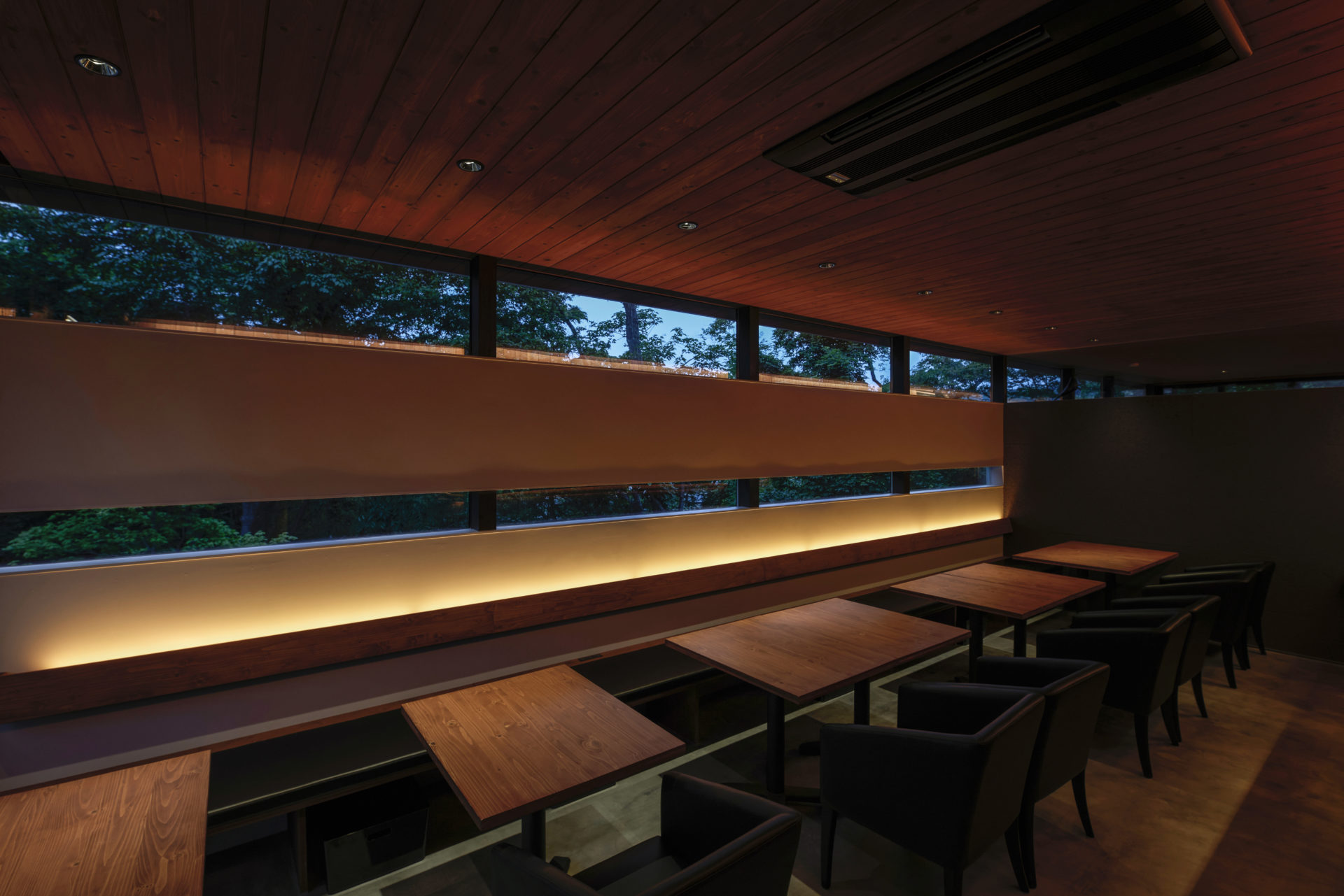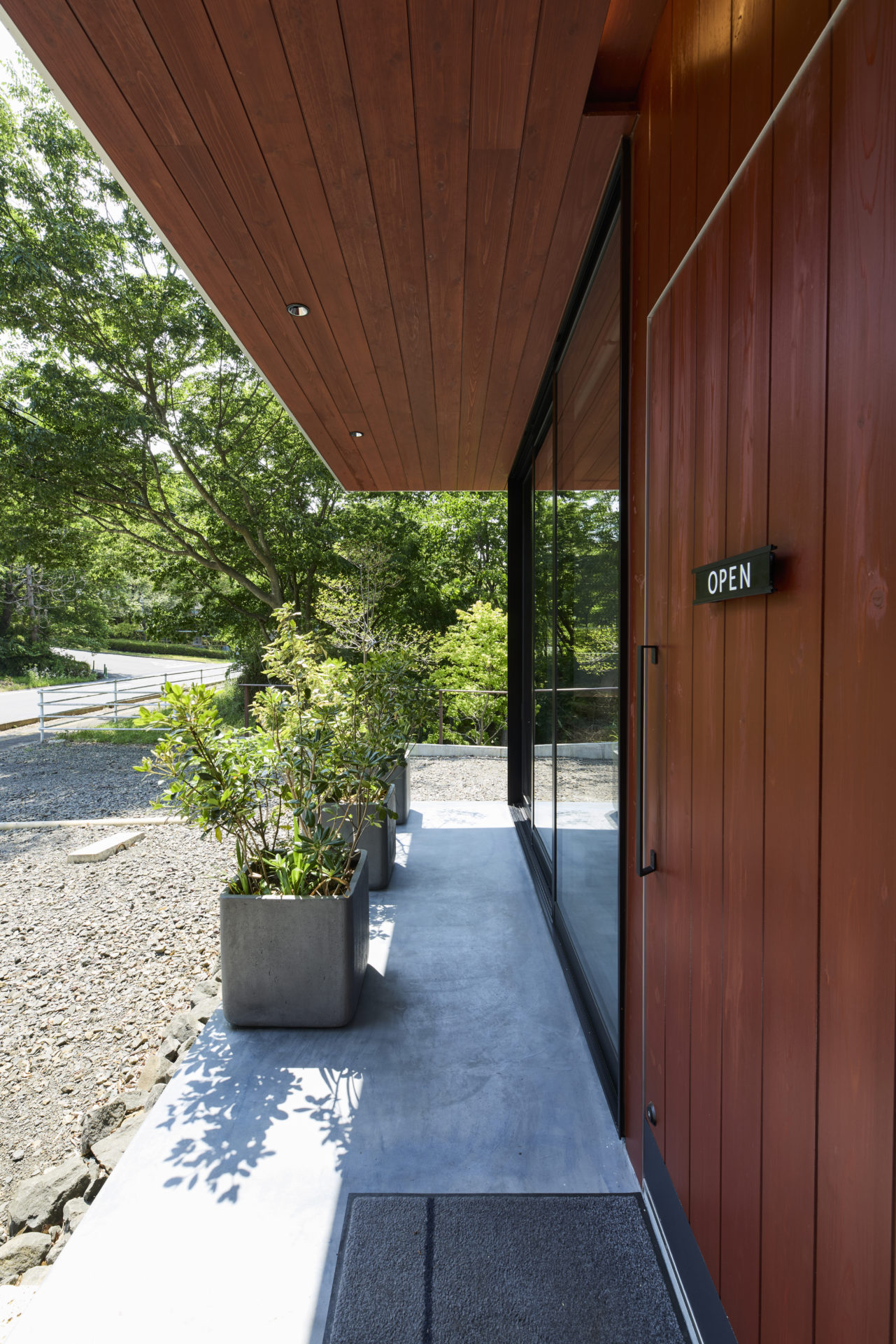 店舗部分は、従来の蕎麦店の形式から離れ、カフェやバーのような落ち着いた雰囲気を求められた。西側にはベンチとテーブル席を、東側にはオープンキッチンとカウンターを配置し、客が調理のリズムや蕎麦の「食べごろ」を間近に感じられる構成とした。仕上げは杉板を深いワインレッドに染め、壁と天井、さらには軒天や外壁にまで連続させている。これにより、内外の境界が曖昧になり、外部の風景そのものが空間に取り込まれる。