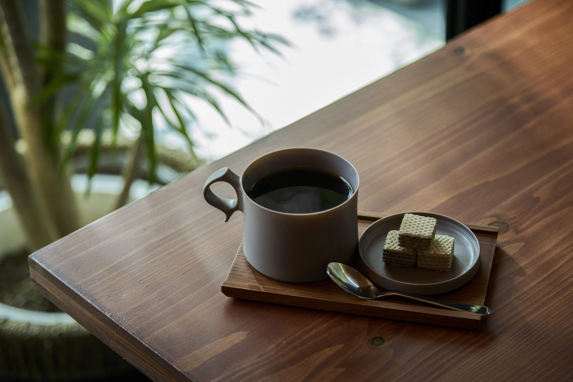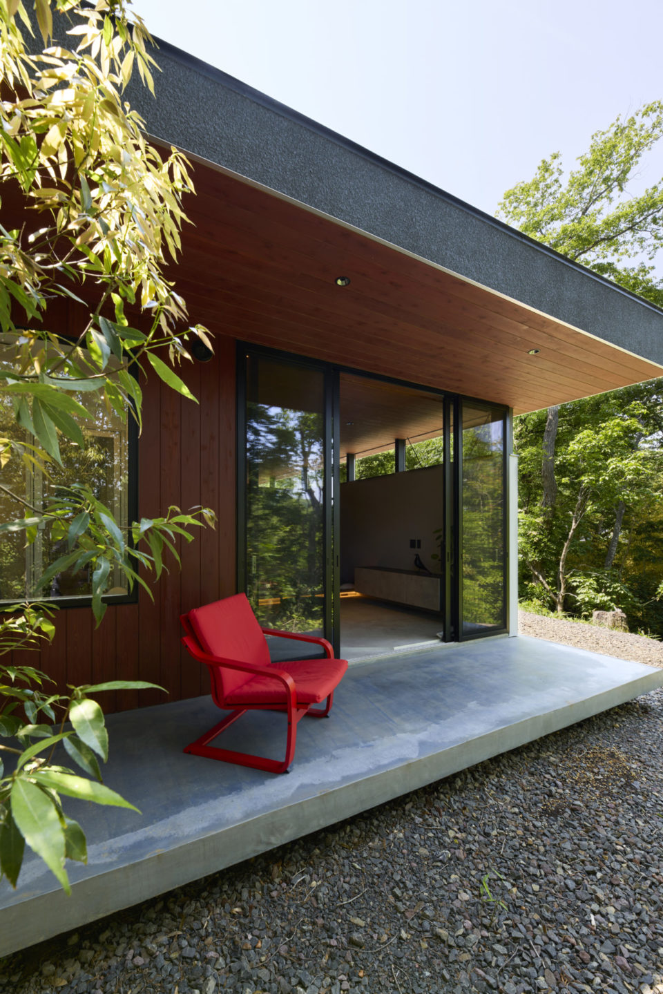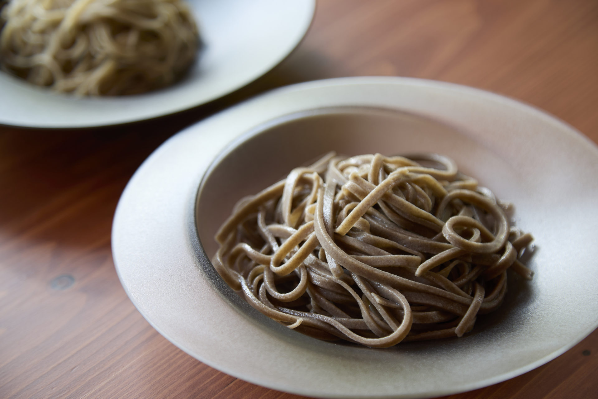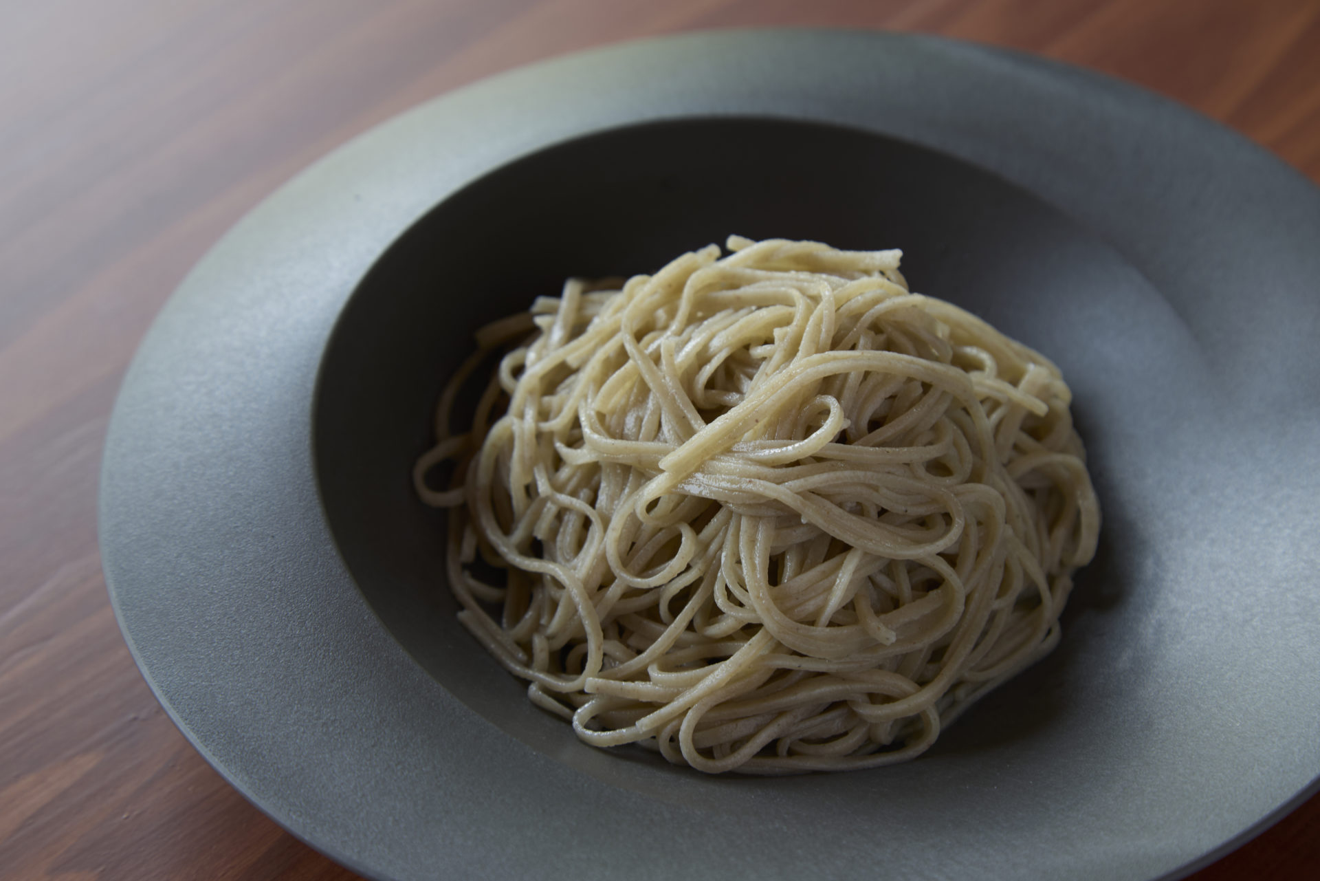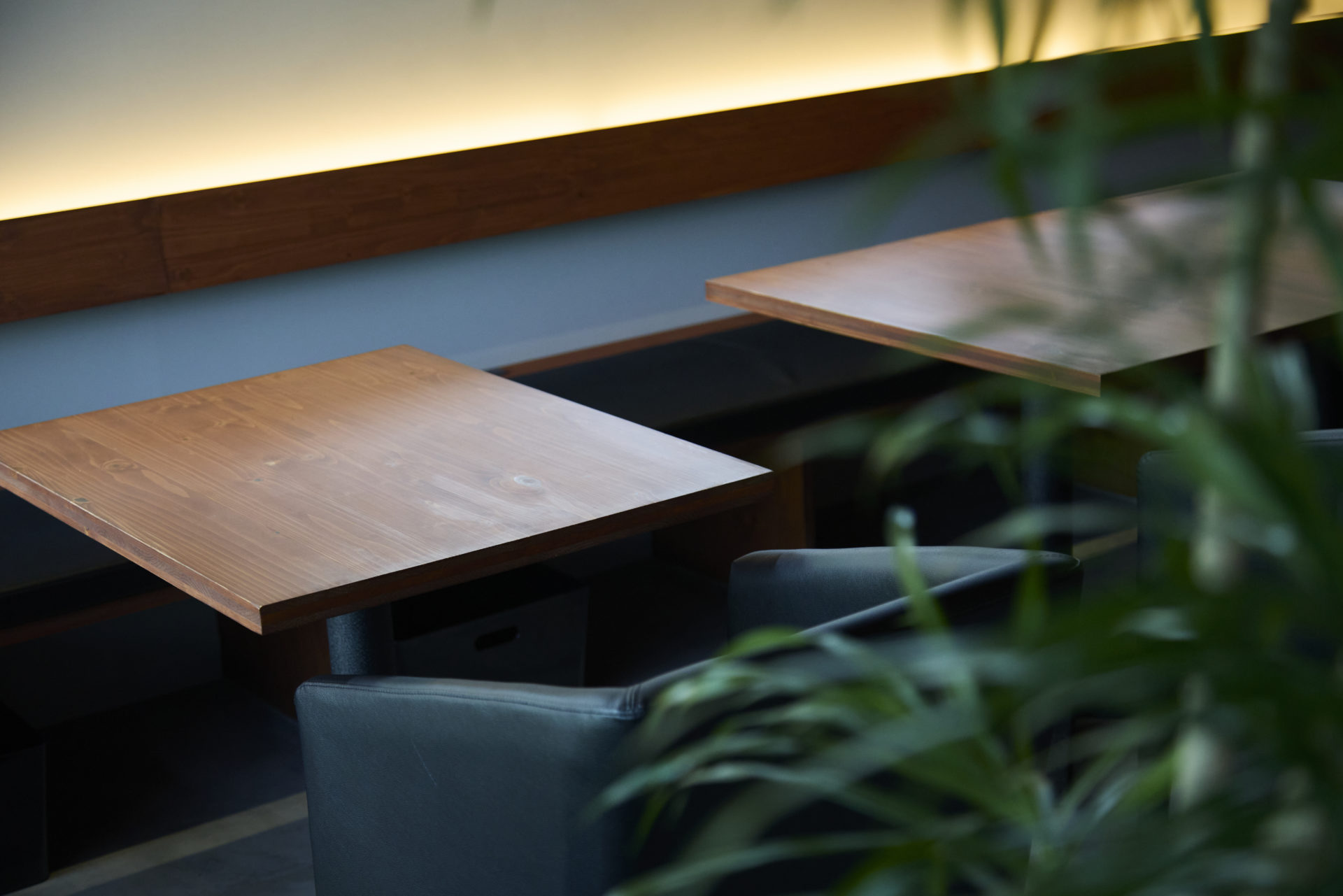 店舗部分は、従来の蕎麦店の形式から離れ、カフェやバーのような落ち着いた雰囲気を求められた。西側にはベンチとテーブル席を、東側にはオープンキッチンとカウンターを配置し、客が調理のリズムや蕎麦の「食べごろ」を間近に感じられる構成とした。仕上げは杉板を深いワインレッドに染め、壁と天井、さらには軒天や外壁にまで連続させている。これにより、内外の境界が曖昧になり、外部の風景そのものが空間に取り込まれる。