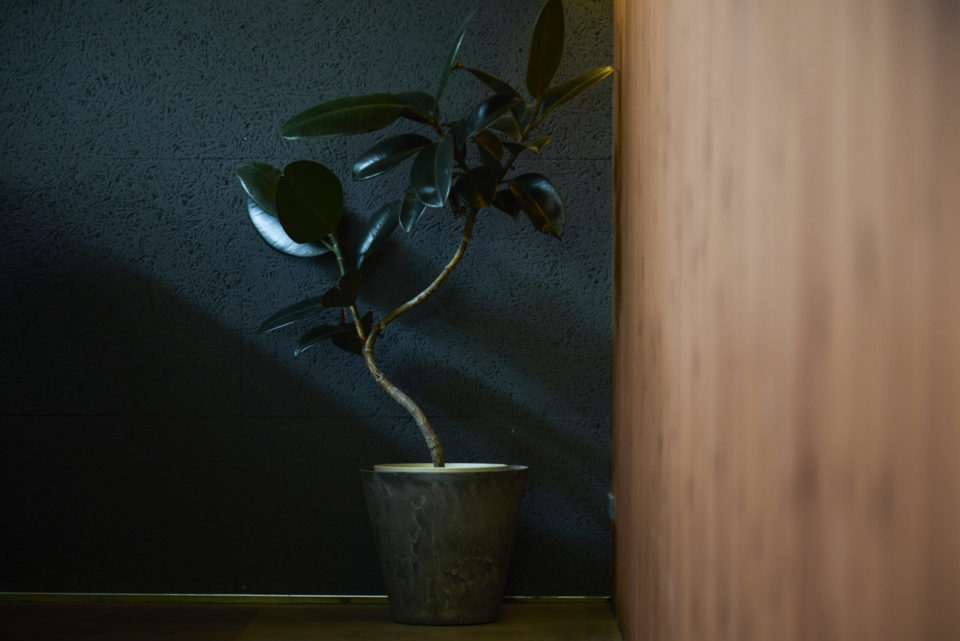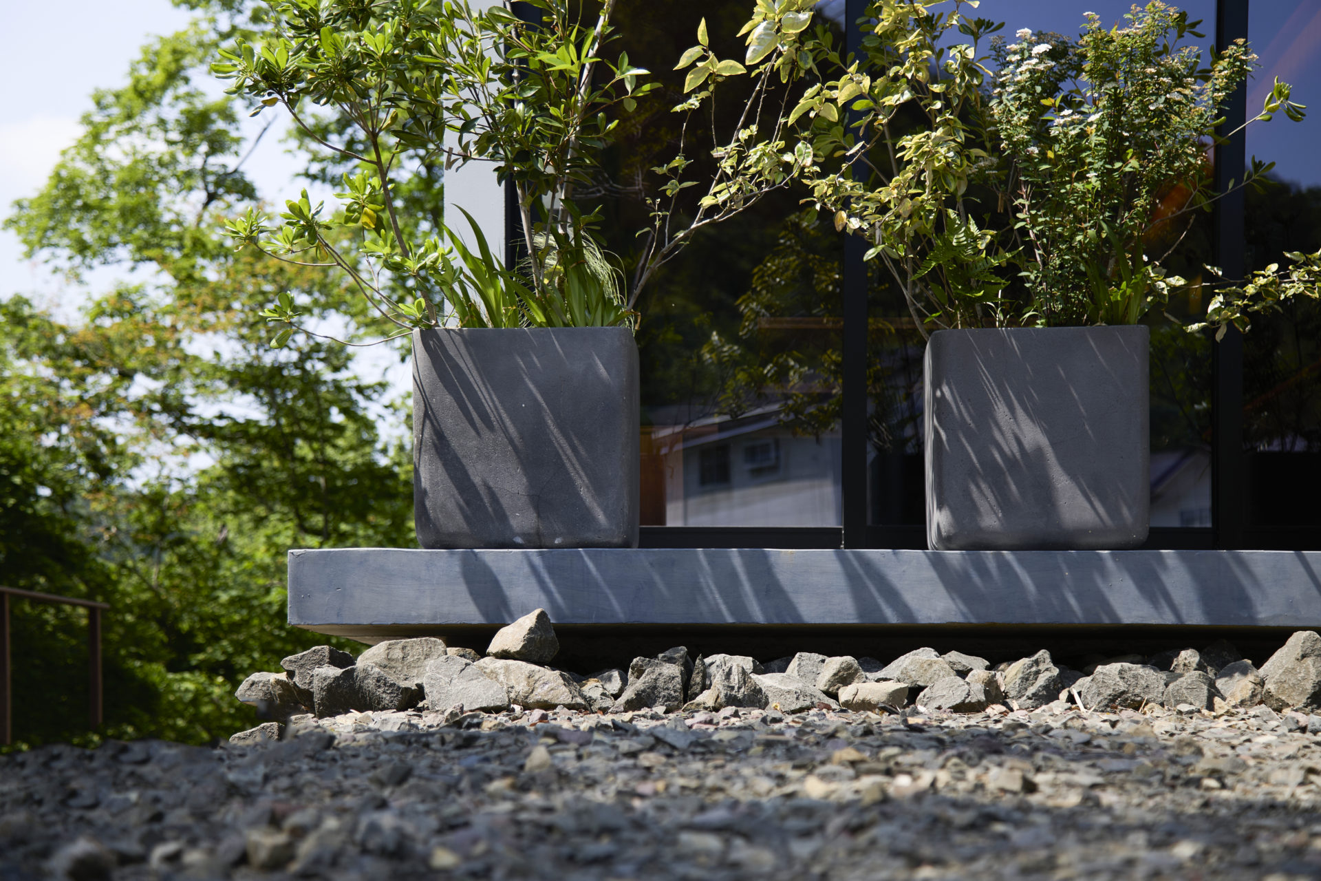 さらに、内部と外部を柔らかくつなぐ庇や、崖に影響を与えないよう浮かせたテラスを南北に備え、内部空間を視覚的にも体験的にも拡張した。ファサードは西側にコの字に開くように構成し、ハイサイドライトを設け、内部のどこからでも緑を感じられるよう計画した。店舗と住宅の間仕切り上部もガラス開口とし、両者の気配が緩やかに響き合うことで、限られた20坪の空間に奥行きを与えている。