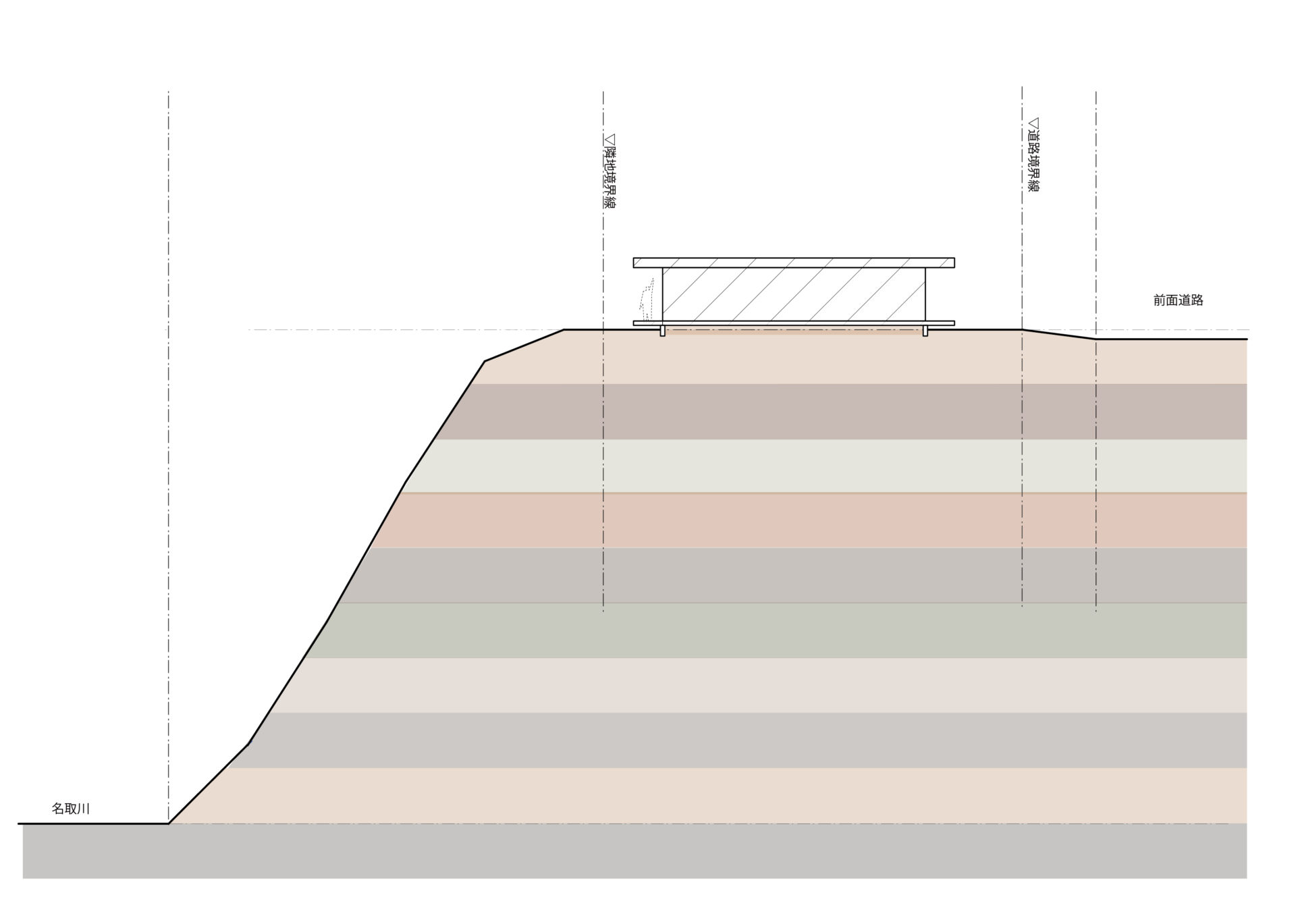 西側にも崖と沢、雑木の森が広がり、建築可能な平場は東側の約1/3に限られていた。そのため、崖に影響を与えない範囲で計画された建物は、南北に細長い20坪程度のボリュームをもつ。