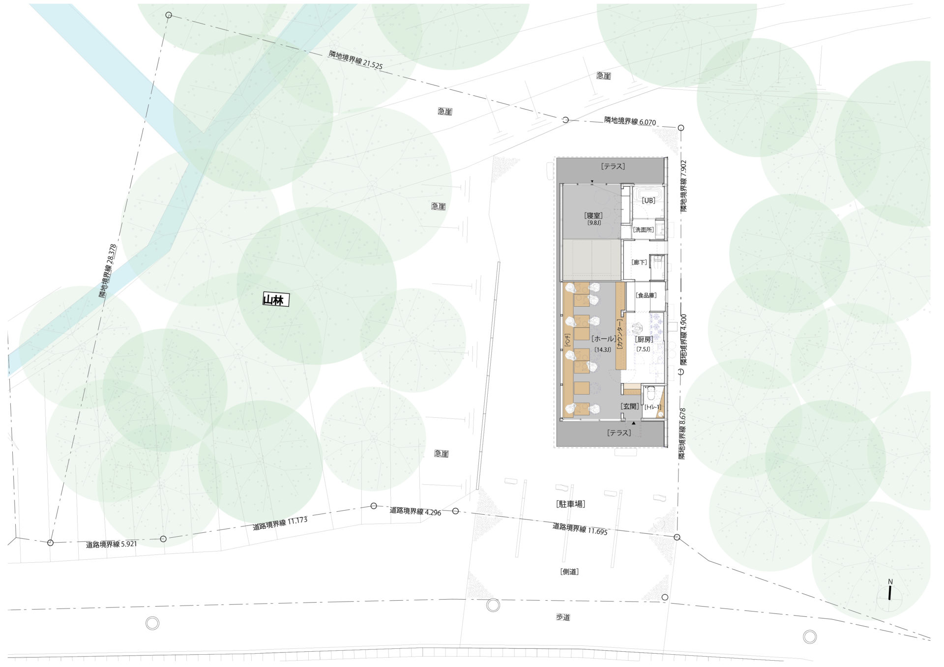 クライアントは、秋保の自然に寄り添いながらこれまでにない蕎麦を提供する15席ほどの小さな店を望んでいた。同時に、自然と共に過ごすホテルライクな週末住宅の実現も求められた。そこで建物は「店舗6:住宅4」の比率で分節され、南の道路側には街に開くように店舗を、北の崖側には渓谷に向かって静かに開く住宅を配置した。